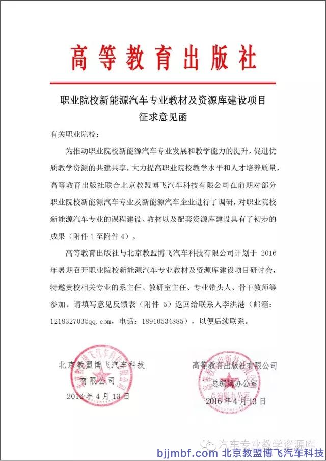 高等教育出版社與北京教盟博飛汽車科技有限公司計(jì)劃于2016年暑期召開高職新能源汽車專業(yè)教材及資源庫建設(shè)項(xiàng)目研討會(huì),特邀貴校相關(guān)專業(yè)的系主任、教研室主任、專業(yè)帶頭人、骨干教師等參加。詳細(xì)內(nèi)容請(qǐng)留聯(lián)系:李洪港(郵箱:121832703@qq.com,電話:18910534885),以便后續(xù)聯(lián)系。