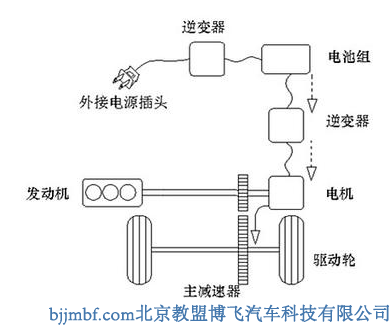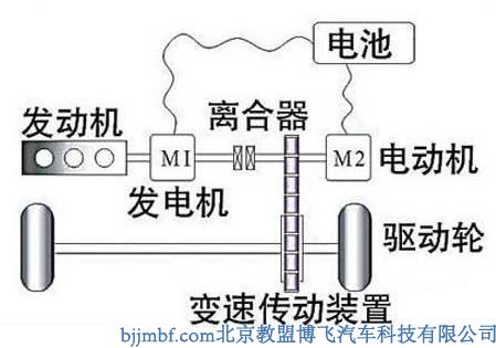 比亞迪F3DM沒(méi)有動(dòng)力分配機(jī)構(gòu),只有簡(jiǎn)單的幾個(gè)離合器,兩個(gè)電機(jī)和1.0升的發(fā)動(dòng)機(jī)在一個(gè)軸上。這個(gè)軸通過(guò)減速器直接驅(qū)動(dòng)車(chē)輪。