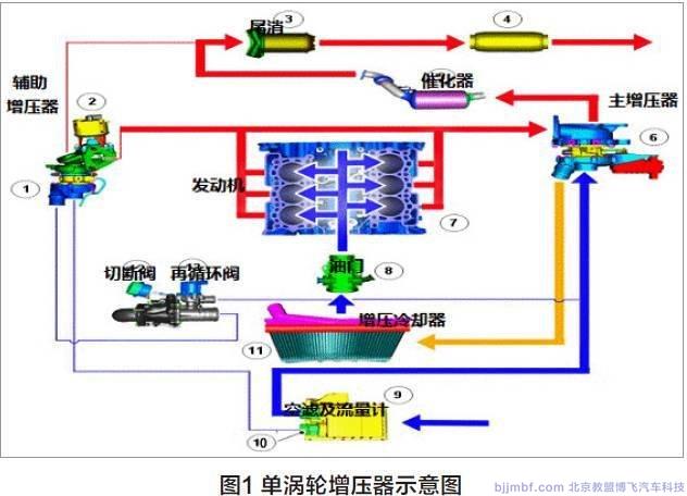綜上故障提示,可以看出造成該車故障的主要原因是在渦輪 增壓器上。針對于該車的渦輪增壓系統(tǒng)做一個系統(tǒng)了解,首先該 車有一個主渦輪增壓器、一個輔助增壓器和 ECM 內(nèi)的軟件, 兩 個渦輪增壓器可在兩種模式下工作:單渦輪增壓器工作或雙渦輪增壓器工作。單渦輪增壓器示意圖如圖1 所示。