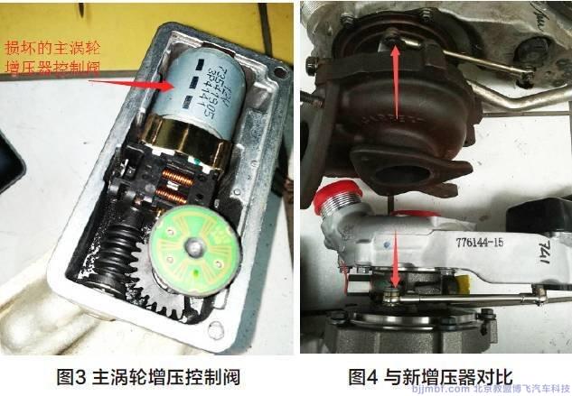 根據(jù)電路圖對電腦到該控制器的線路進(jìn)行檢查,其測量結(jié)果 為3# 號線和4# 線在急加油和收油時交叉有電,1#、4#有5V 電壓,也說明問題出現(xiàn)在主渦輪增壓控制器內(nèi)( 圖3),拆下增壓 器與新增壓器做比對( 圖4),其位置在中間位置,沒能在收油或熄火后回位。
