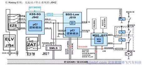 上圖是帶有一鍵啟動防盜系統(tǒng)的原理圖,帶有一鍵啟動系統(tǒng)的車型和沒有此系統(tǒng)的車型,最大的區(qū)別就是在點火開關(guān)、啟動按鈕和J527 之間加如一個J942 接線端和發(fā)動機啟動控制單元。