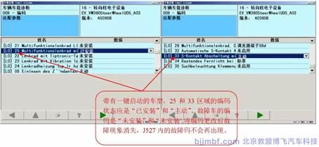 車輛用鑰匙可以正常啟動,目前其他系統(tǒng)部件都沒有發(fā)現(xiàn)問題,應是J942有故障了。更換了新的J942故障現(xiàn)象仍然依舊。啟動按鈕和J942都排除后最后就只剩下J527沒有檢查了,此時想起了J527系統(tǒng)報出的故障碼:端子15對正極短路,起初沒有對這個故障碼引起重視。J527在裝備有一鍵啟動的車型中承擔了更多的信號輸送任務。檢查了J527的相關(guān)供電接地線路沒有發(fā)現(xiàn)異常,但在檢查編碼時發(fā)現(xiàn)當前J527的編碼和不帶一鍵啟動車型的編碼一樣。如下圖所示: